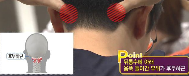 2. 엄지손가락으로 후두하근을 20초간 눌러줍니다.