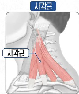 머리는 손 방향으로 향하고, 손은 머리방향으로 각각 밀어 저항을 주게 되면 목빗근 뒷부분이 움푹 들어가는데, 그 곳이 바로 사각근 입니다.