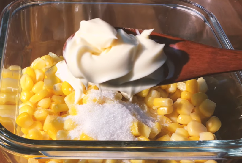 물기를 완전히 뺀 옥수수콘에 설탕 1숟갈, 마요네즈 3숟갈, 맛소금 3꼬집을 넣어줍니다.