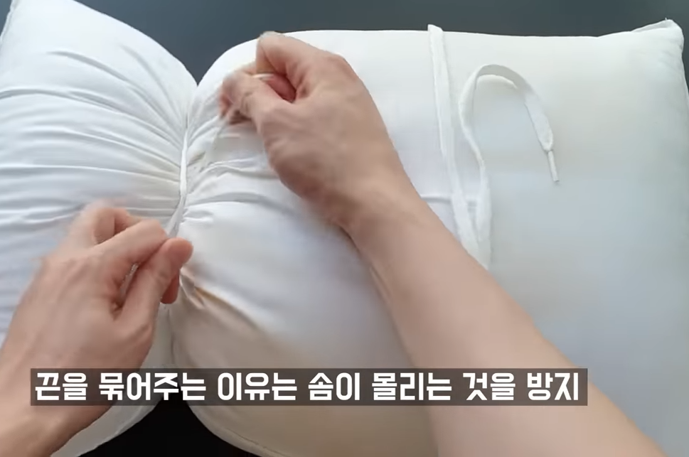 준비물로 운동화 끈을 간격을 잘 유지하며 베개를 뒤집은 후에 묶어줍니다.