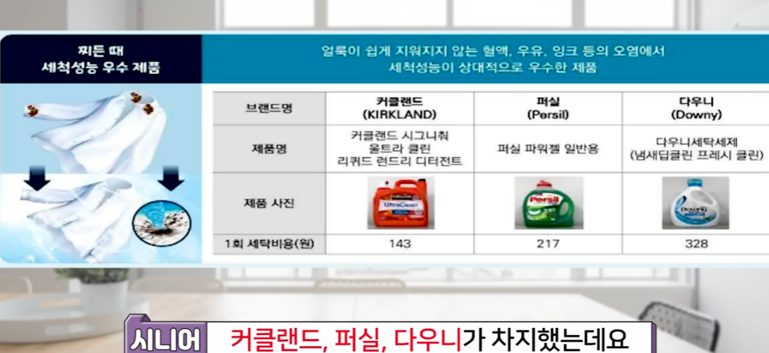 세탁 비용까지 비교해 보자면 커클랜드가 143원, 퍼실이 217원 다우니가 328원을 차지했습니다.