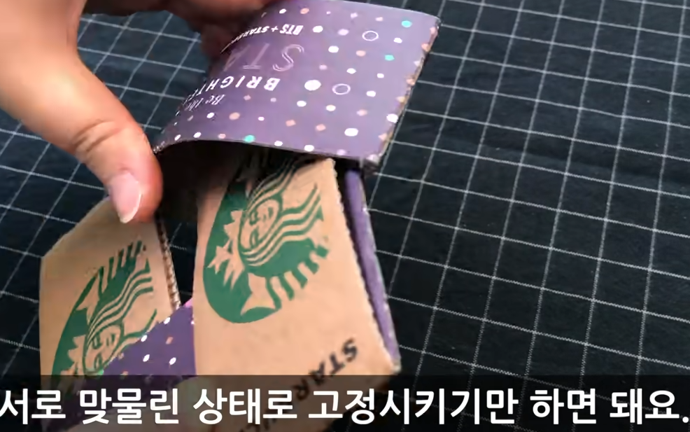 음료캐리어의 손잡이 부분을 가위로 잘라내고 컵홀더를 네모 모양으로 잡아준 뒤에 넣어주시면 됩니다.
