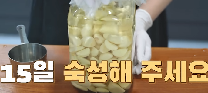 15일이 지나 잘 숙성된 마늘은 식촛물을 걸러내고 마늘만 사용합니다.