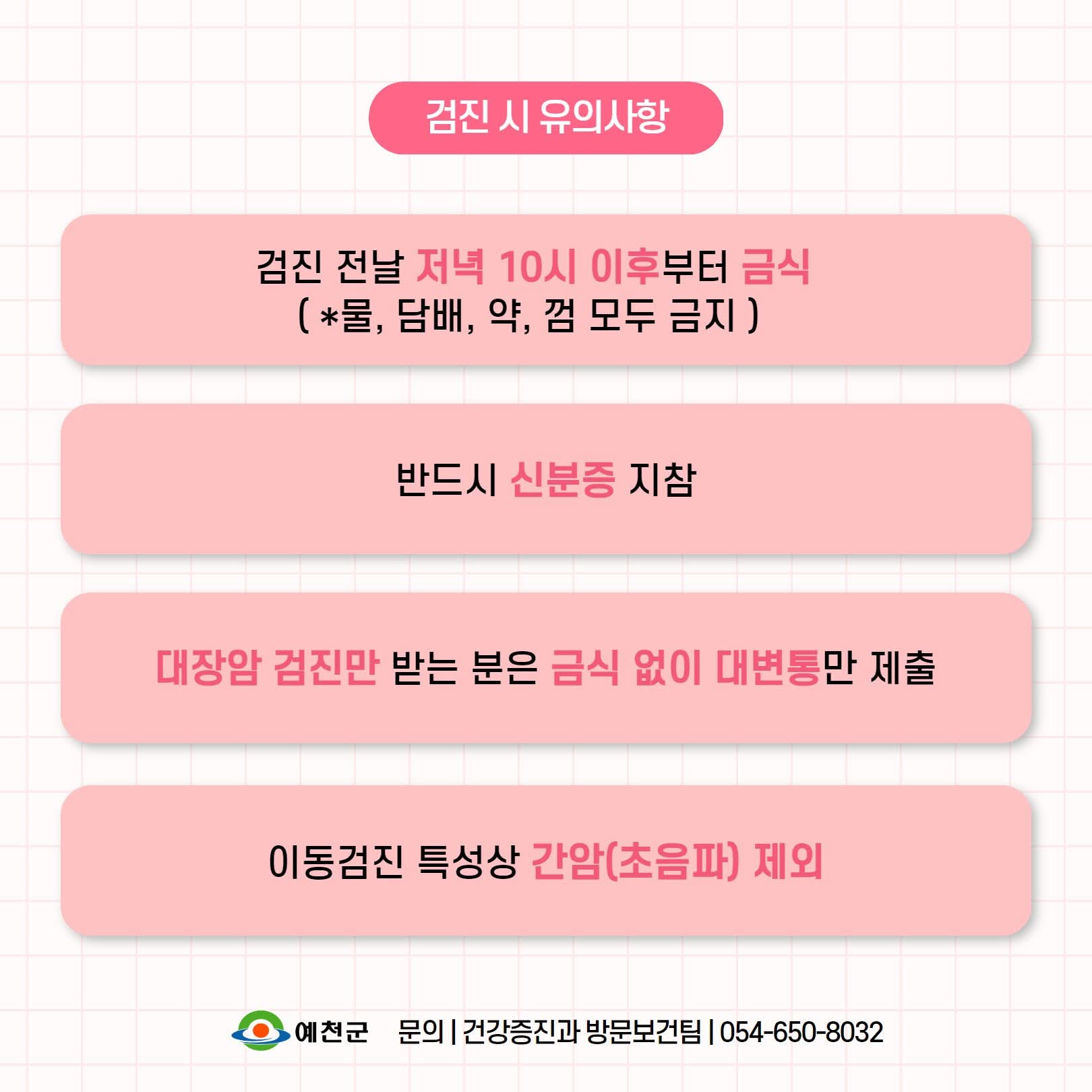 - 검진 전날 저녁 10시 이후부터 금식(*물, 담배, 약, 껌 모두 금지)
