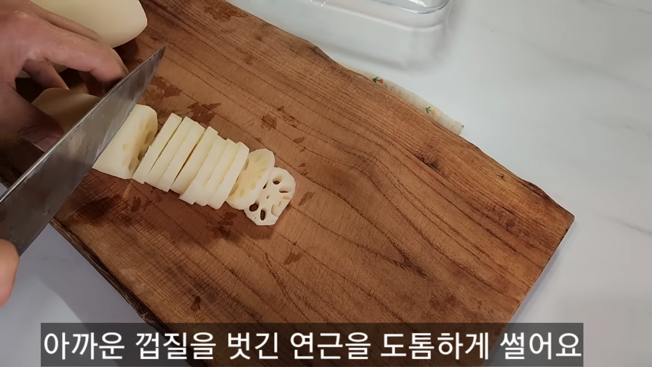 껍질을 벗긴 연근을 도톰하게 썰어줍니다. 연근은 갈변이 쉽게 되기 때문에 요리하기 바로 전에 손질하시길 권합니다.