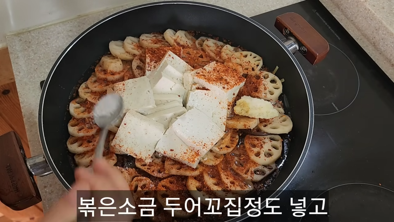 재료- 연근 작은사이즈 3뿌리 고사리 한줌 마늘쫑나물 한줌 두부 300그램 물 1리터 다진마늘 1큰술 고춧가루 3큰술정도 국간장 2큰술 소금 1작은술 홍합간장 2큰술 송송썬고추 2큰술정도