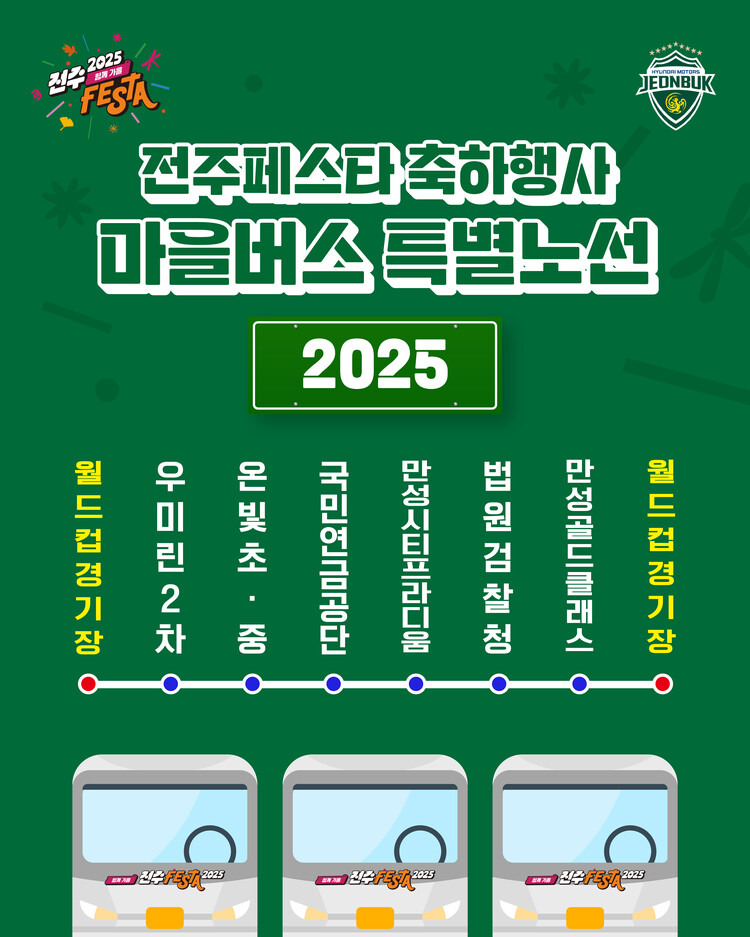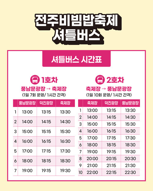 - “한옥마을(풍남문광장) ↔ 전북대(덕진광장) ↔ 축제장” 구간으로 2대 순환 운영된다는 언급이 SNS에 있습니다.