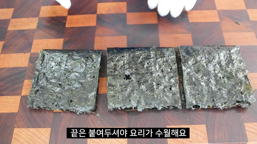 김을 반으로 접고, 각각을 3등분으로 자릅니다.