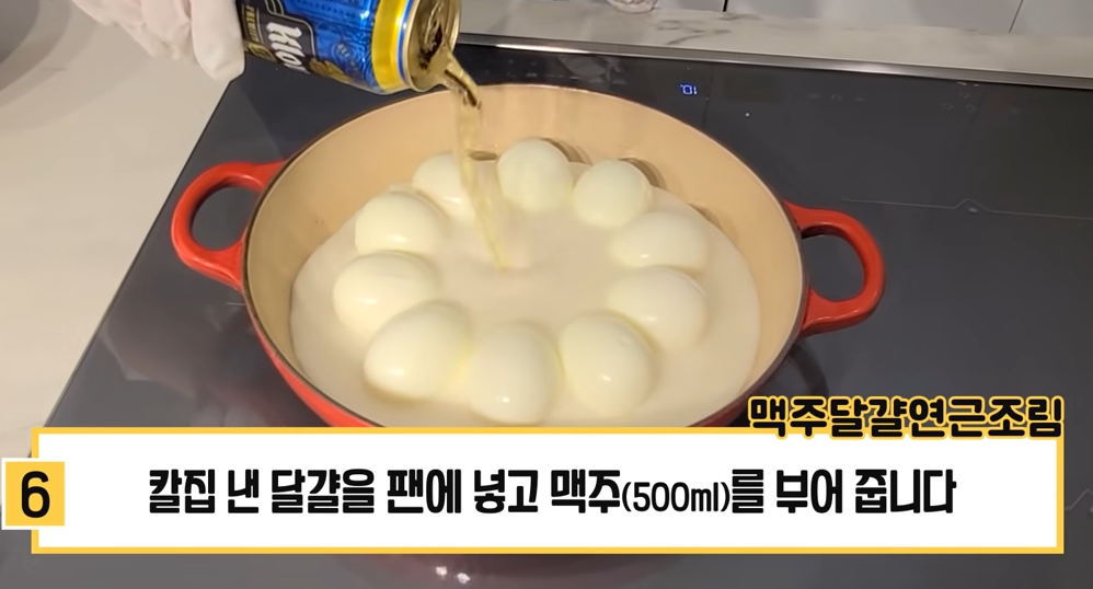 6. 칼집 낸 달걀을 팬에 넣고 맥주 (500ml)를 부어 줍니다