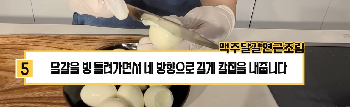 5. 삶은 달걀은 빙 돌려가면서 네 방향으로 길게 칼집을 내줍니다.
