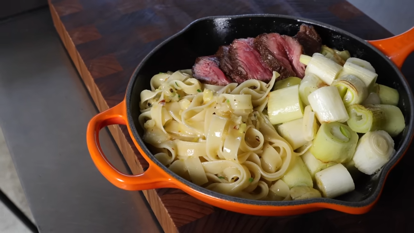 대파를 한쪽에 밀어넣고 파스타를 올리고 마지막으로 스테이크를 올려 완성합니다.