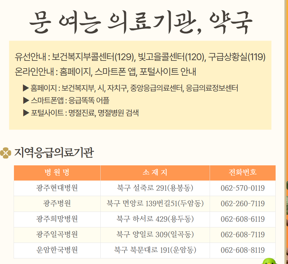 - 유선 : 보건복지부 콜센터(129), 빛고을콜센터(120), 구급상황실(119)