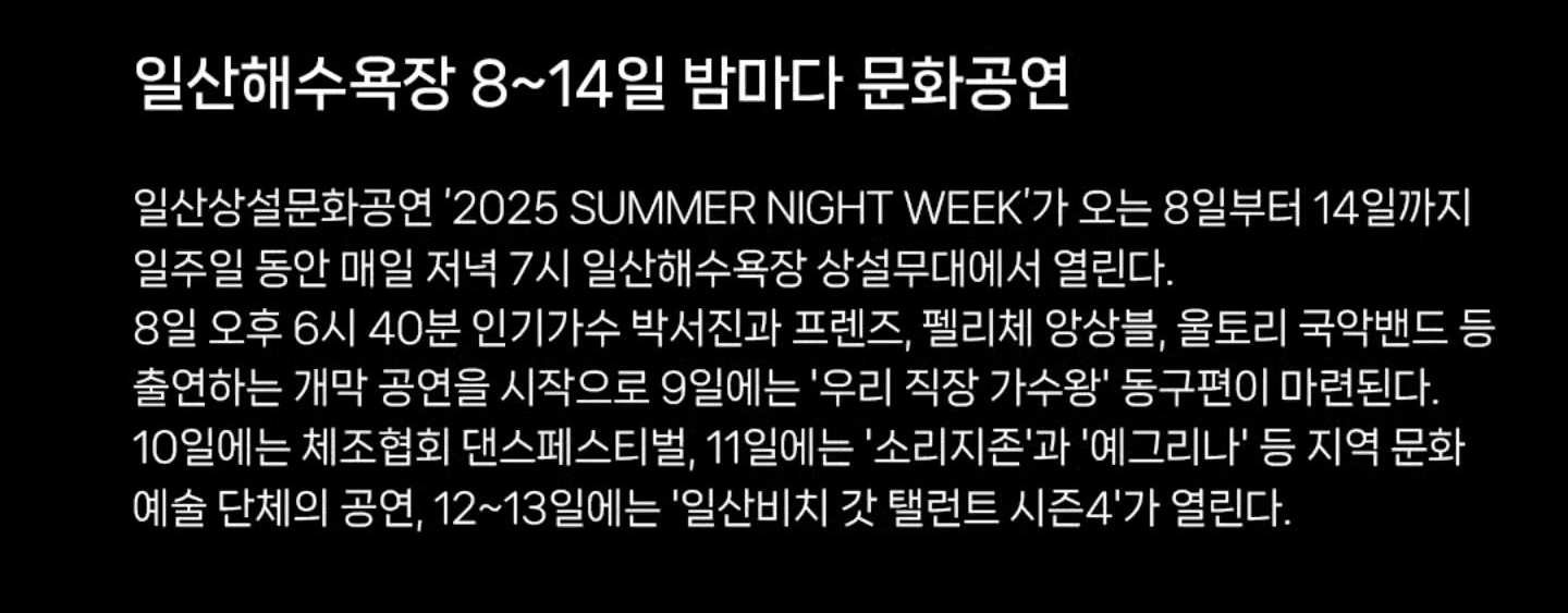 - 일정: 2025년 8월 8일(금)부터 8월 14일(목)까지, 매일 저녁 7시에 시작합니다. 행사 무대는 일산해수욕장 상설 무대입니다.