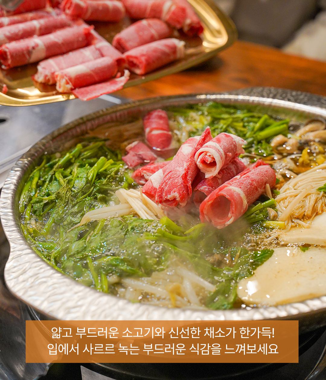 이 요리는 신선한 고기와 다양한 채소가 함께 제공되어, 각자 취향에 맞게 조리할 수 있는 점이 매력적입니다.