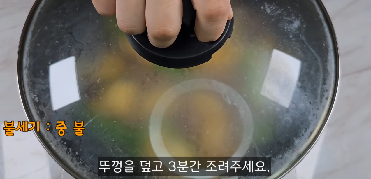 3분간 뚜껑을 덮고 졸여준 후, 뚜껑을 열어 섞어준 뒤 다시 2분간 졸여줍니다.