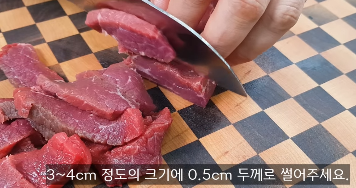 2. 소고기 200g은 3~4cm 크기에 0.5cm두께로 썰어줍니다.