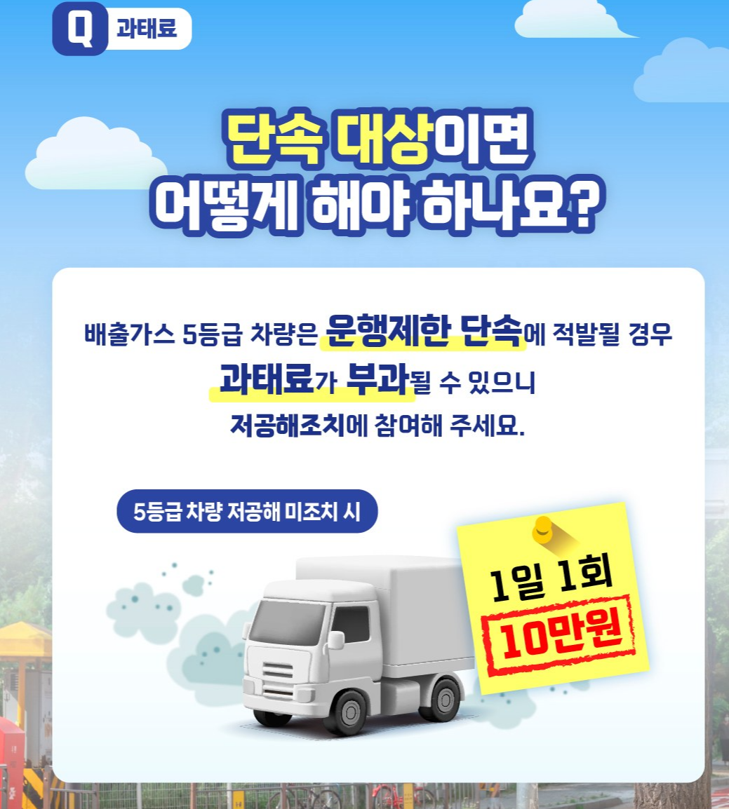 | 예외 차량 | 아래에 해당하는 차량은 단속 제외됨: - 긴급자동차 (예: 구급차) - 장애인용 차량 - 저감장치 부착 차량 - 저감장치 부착이 불가능한 차량 (예: 일부 생계형 차량, 저소득・소상공인 소유 차량 등) |