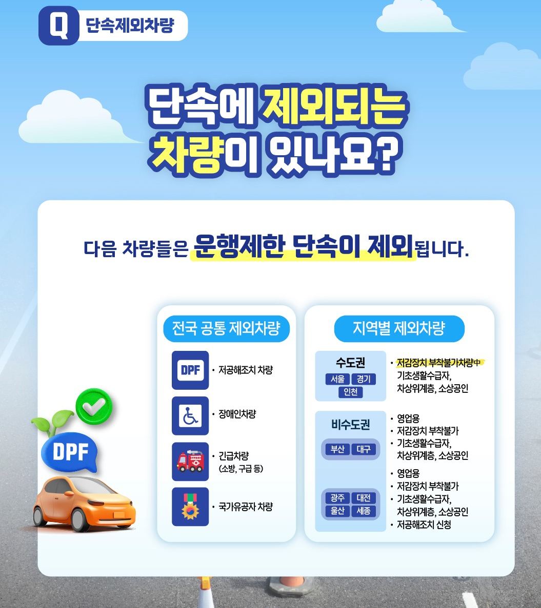 ▪저공해 조치 완료 차량(DPF 부착 등), 장애인 차량, 긴급 차량(소방, 구급 등), 국가유공자 차량.