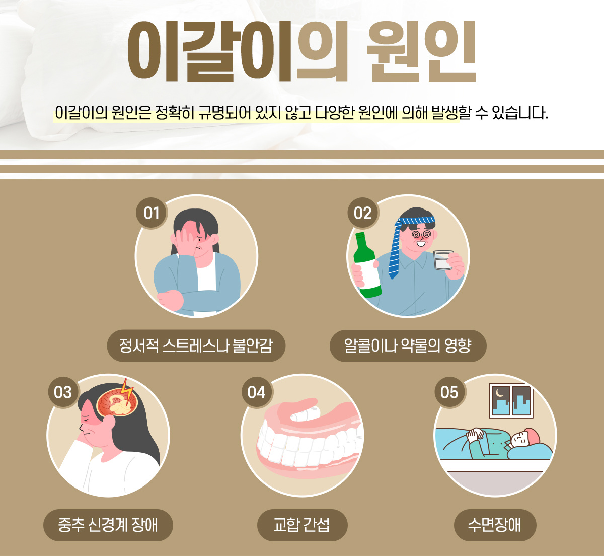 - 치아 정렬 문제 : 치아가 올바르게 정렬되지 않으면 이갈이가 발생할 수 있습니다.