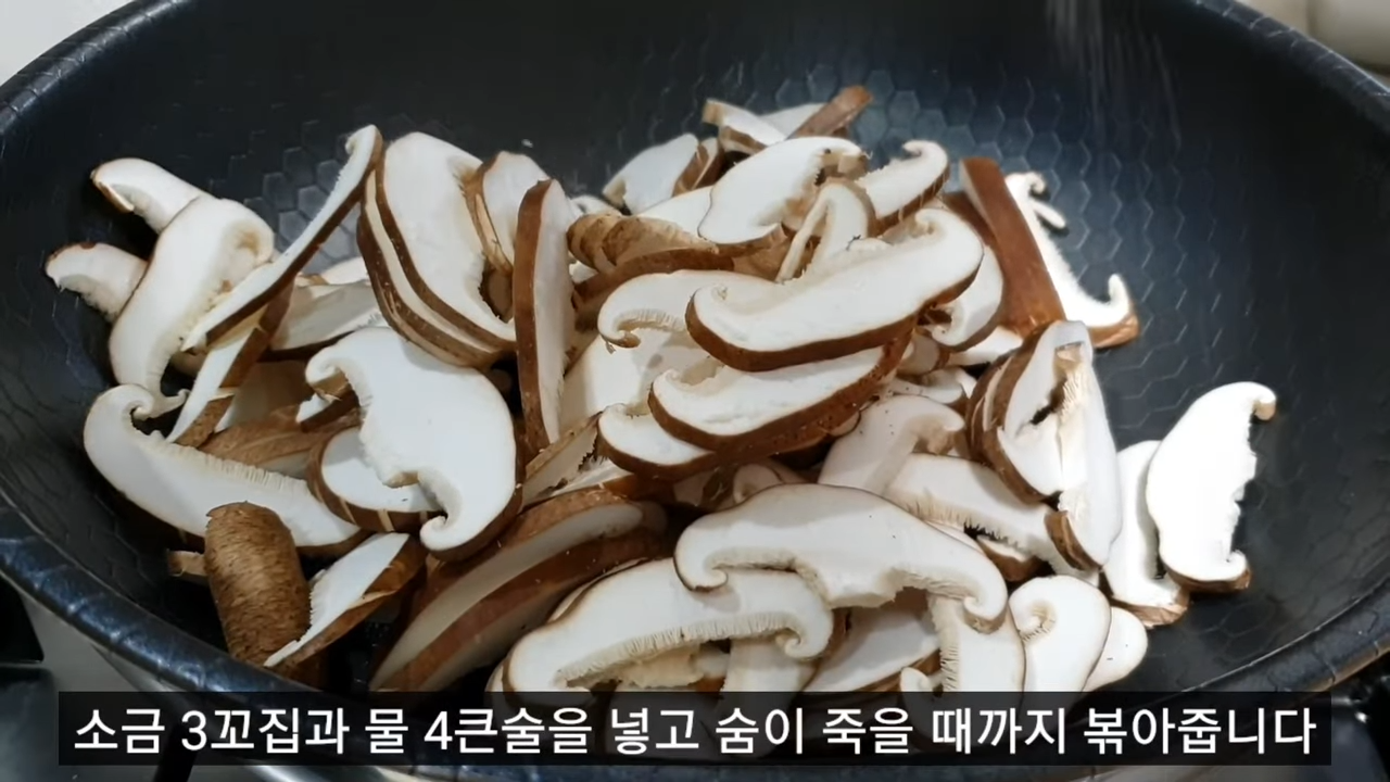 기름을 두르지 않은 팬에 표고버섯을 넣고 소금 3꼬집과 물 4큰술을 넣고 숨이 죽을 때까지 볶아줍니다.