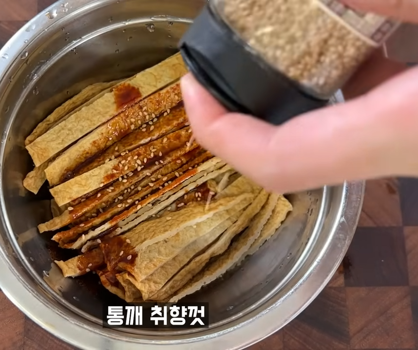 3. 어묵위에 양념을 부운 뒤 통깨를 뿌려 버무려줍니다.