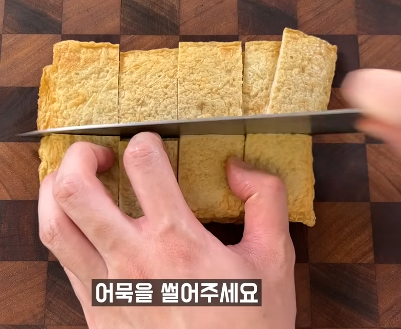 1. 뜨거운물에 담군 어묵은 먹기 좋은 크기로 썰어줍니다.