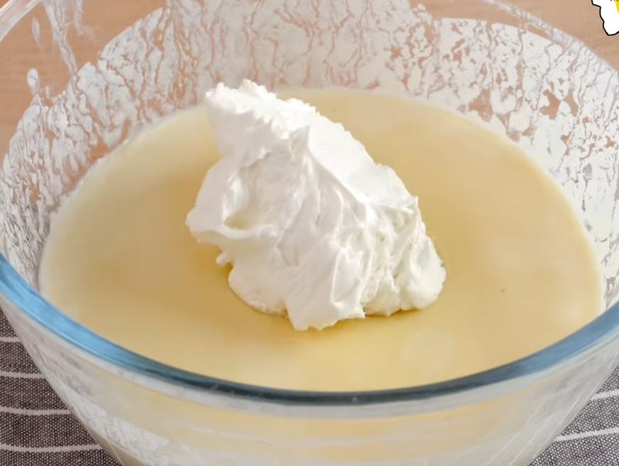 그리고 냉동실에서 아이스크림 반죽을 꺼내 휘핑크림을 넣어줍니다.