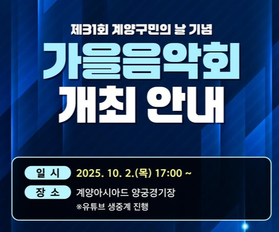 계양구는 「제31회 계양구민의 날」을 맞아 구민 여러분과 함께하는 가을음악회를 개최합니다.