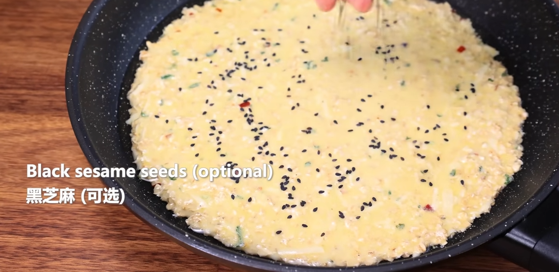 오트밀 반죽을 얇게 깔아준 후 위에 검정깨를 뿌려줍니다.