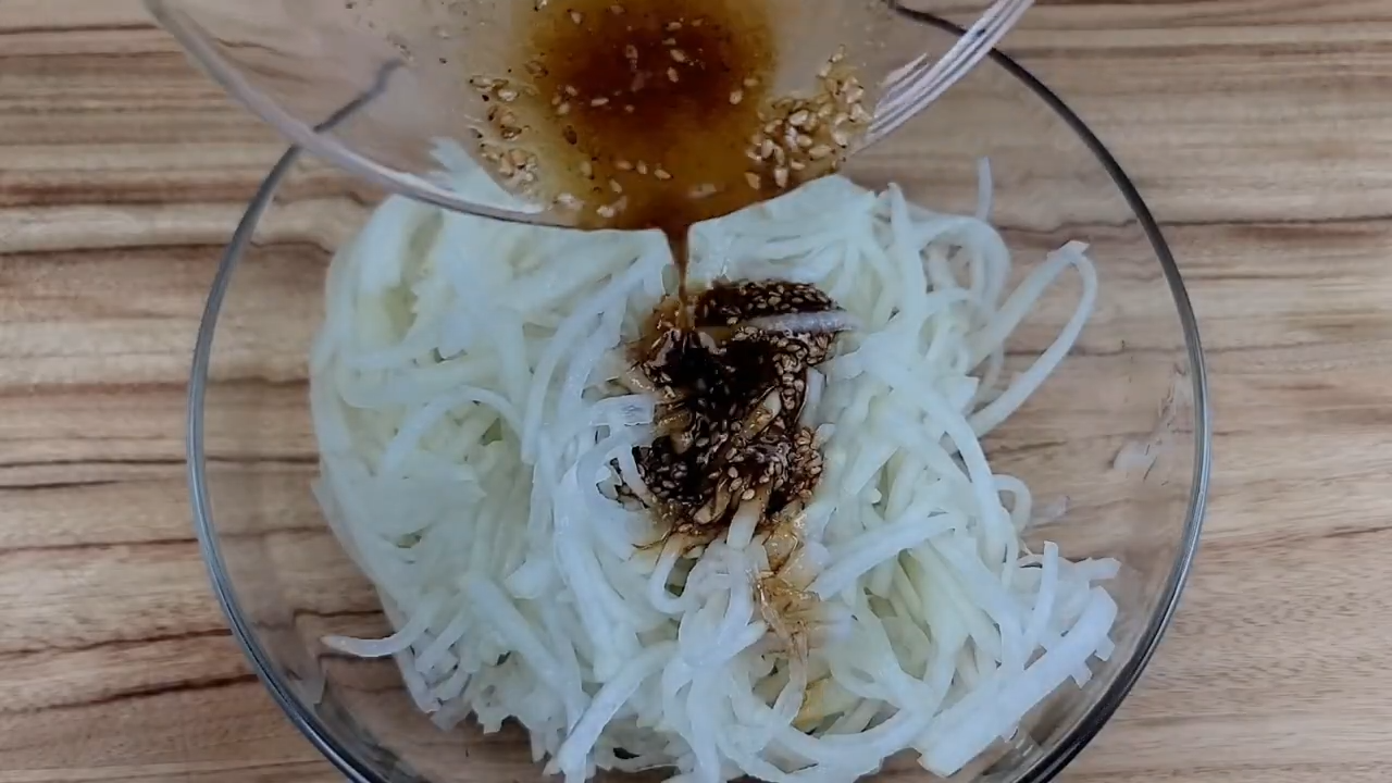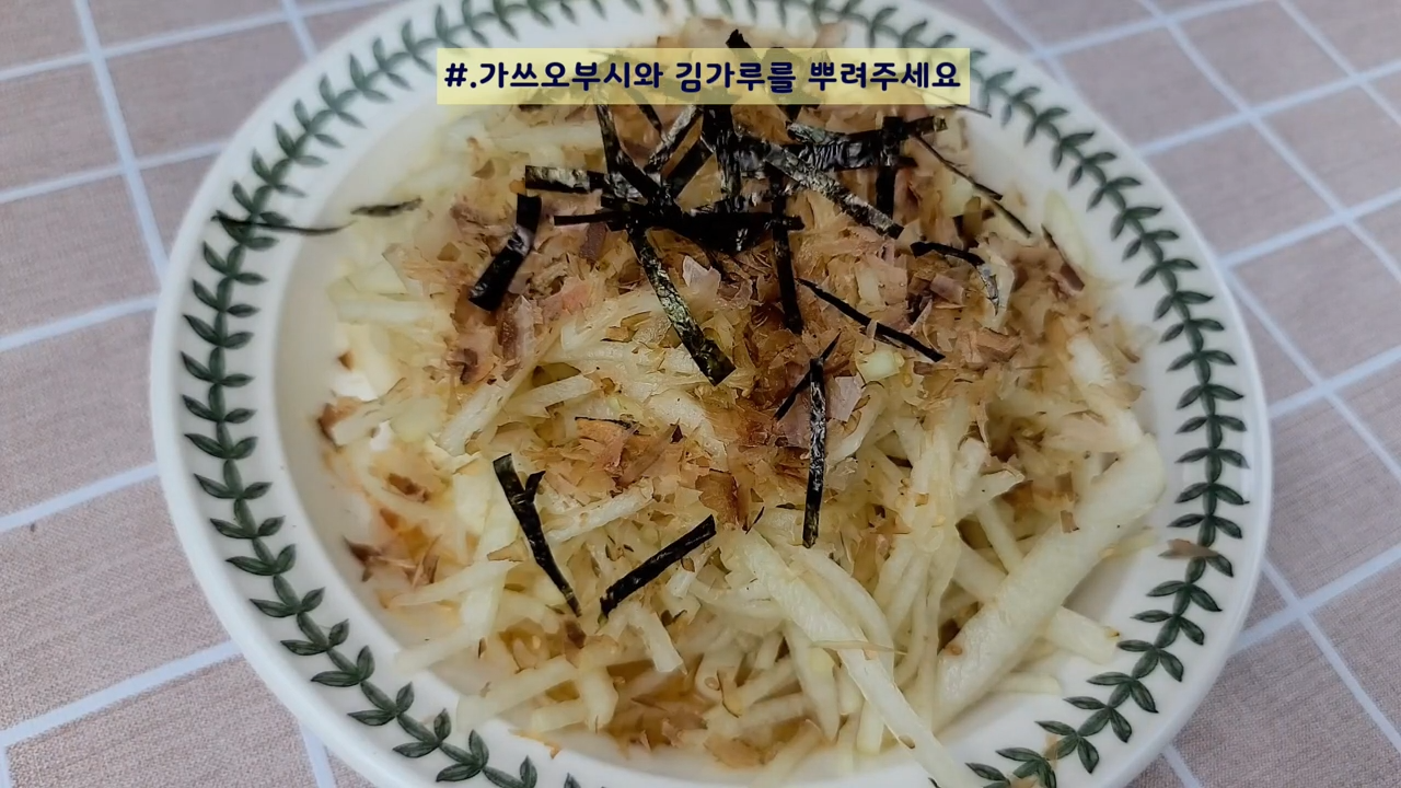 고추가루가 들어가는 무생채와 달리 간장과 식초로 더 담백하고 덜 자극적으로 드실 수 있답니다.