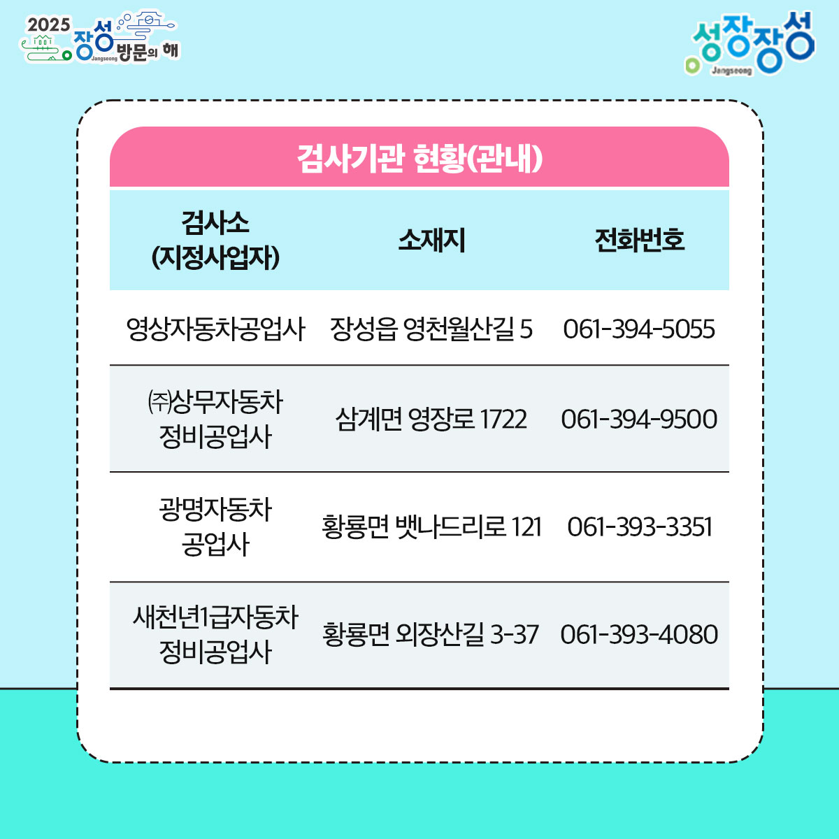 - 장성군은 2025년도에 장애인 대상 자동차 정기검사 및 종합검사 비용을 일부 지원했습니다.