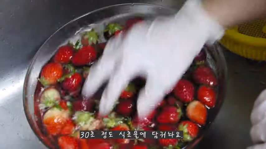 1. 생딸기가 주재료이기 때문에 식초물에 담궈 깨끗하게 씻어줍니다.