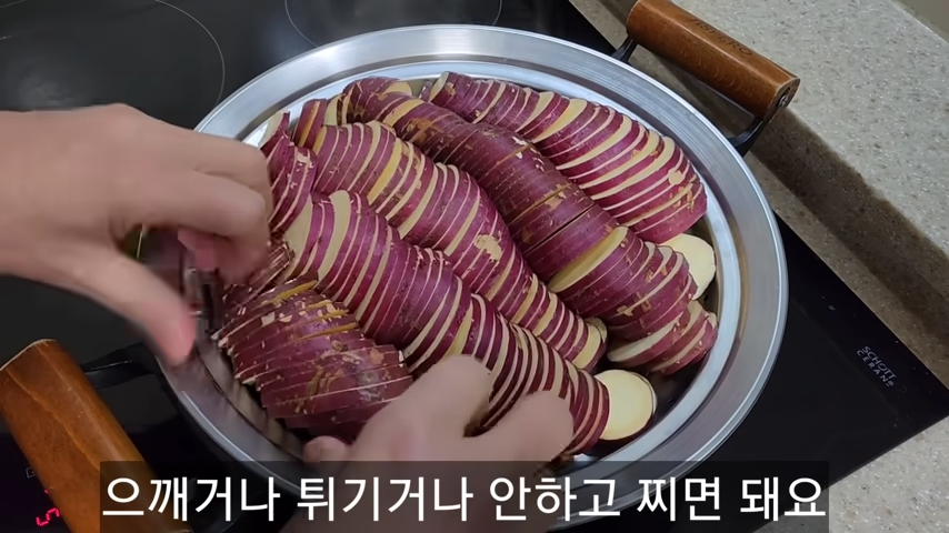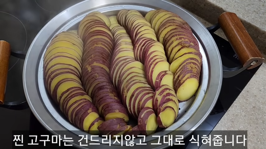 고구마는 익히기 전에 껍질 채로 얇게 썰어줍니다.
