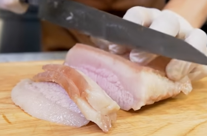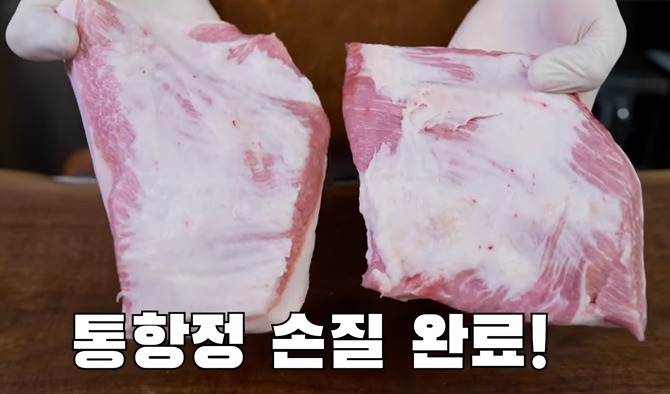 통항정살(미박항정살 이라고도 부름)은 보통 정육점에서 손질이 안된 채로 팔기 때문에 피가 묻은 겉면을 얇게 손질하고 만약 껍데이 반대편에 돼지 임파선이 있다면 그 부분도 도려내줍니다. 필요 이상의 지방도 제거해줍니다.