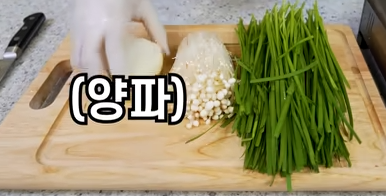 부추는 3분의1로, 팽이버섯은 아래 지저분한 곳을 제거하고 양파는얇게 슬라이스합니다.