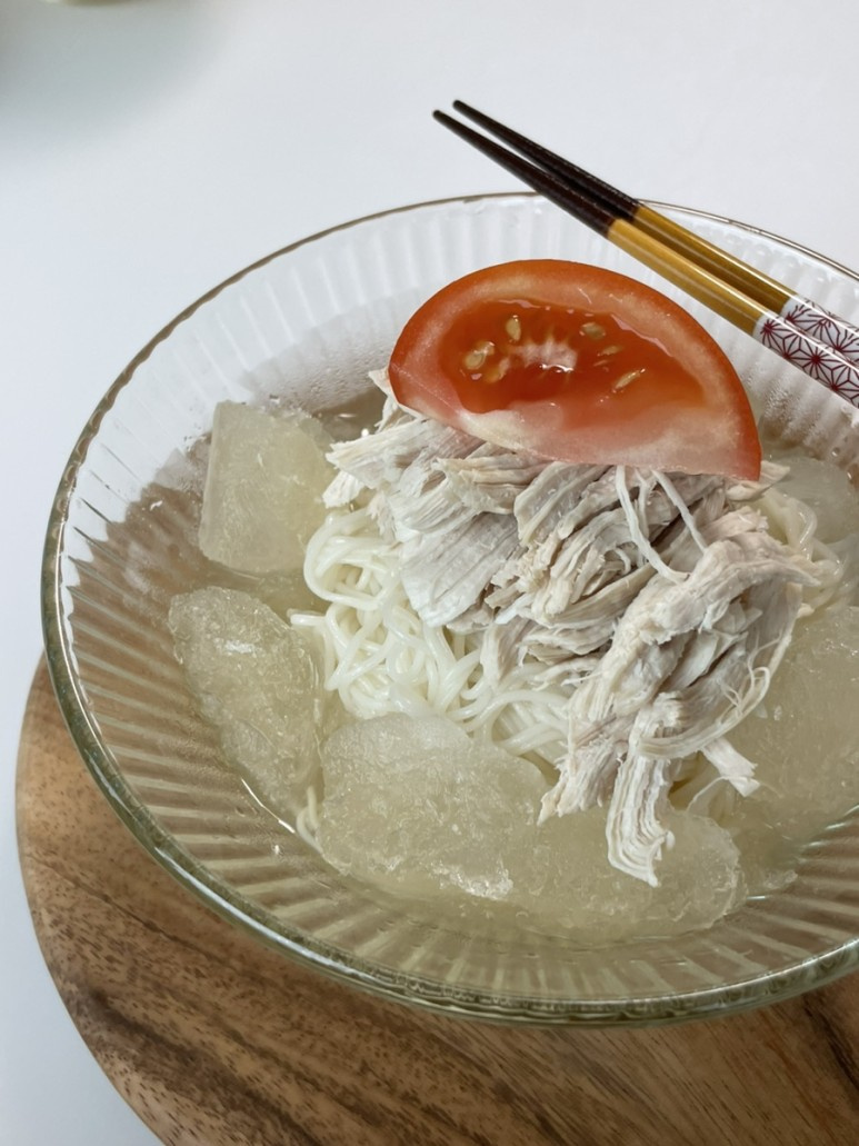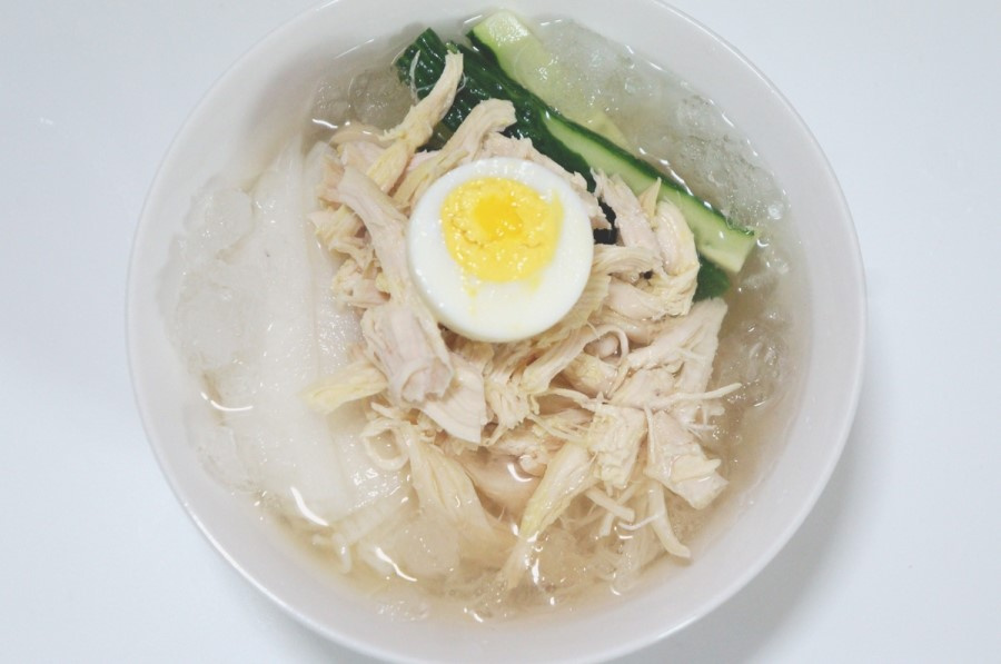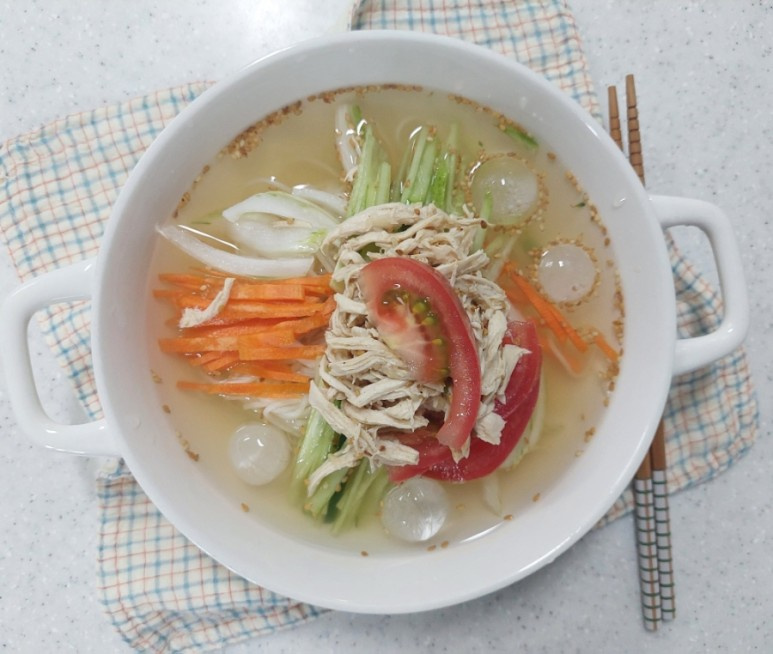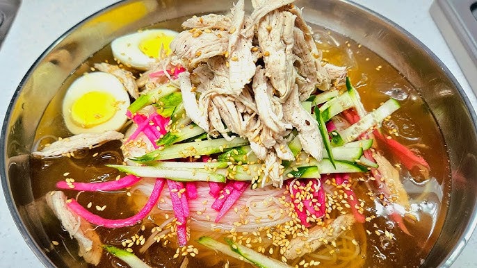 - 그릇에 면을 담고, 절인 채소와 닭가슴살, 삶은 계란, 고명(통깨·겨자 등)을 예쁘게 올린 후, 차가운 육수를 부르면 완성!