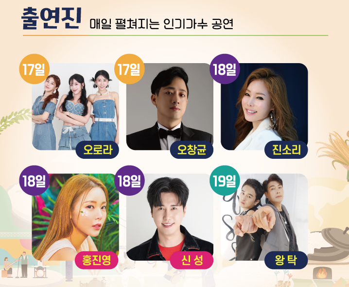 매일 펼쳐지는 인기 가수 공연으로 축제의 열기를 더합니다!