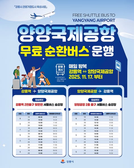 강릉시에서 강릉역 ↔ 양양국제공항 구간에 무료 광역순환버스 운행을 2025년 11월 17일부터 개시합니다.