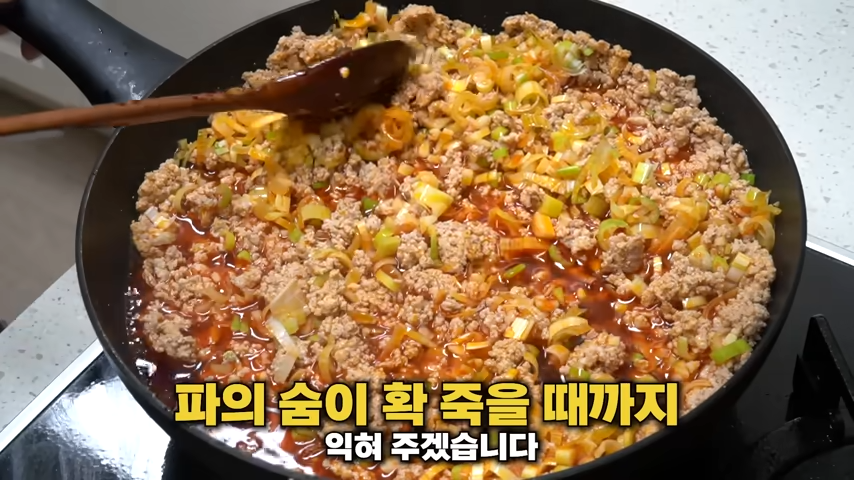 대파가 갈색이 나면 불을 끄고 파를 건전해주세요.