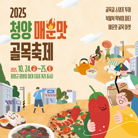 2025년 10월 24일(금)부터 25일(토)까지 이틀간 충남 청양군 청양읍 청춘거리에서 열리는 청양 매운맛 골목축제는 청양의 특산물인 청양고추를 활용한 다양한 매운 음식을 즐길 수 있는 축제입니다.