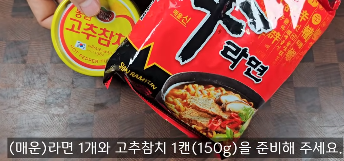 먼저 매운 맛이 강조된 라면 한 개를 준비합니다.