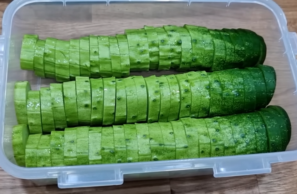 2. 통에 썰어놓은 오이를 나란히 넣어주세요.