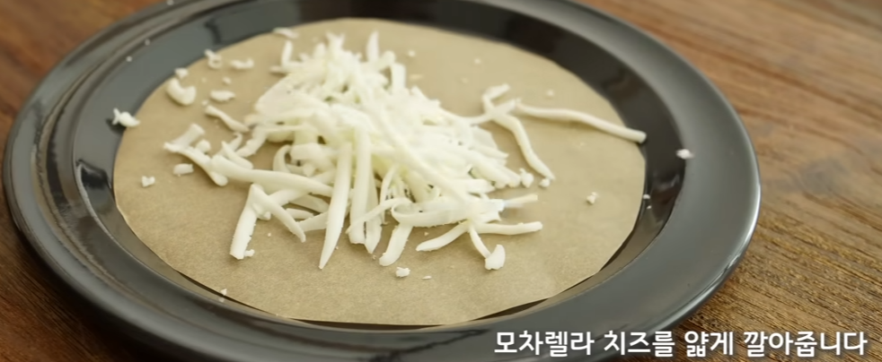 오븐용 접시에 기름종이를 크기에 맞게 잘 자른 후 깔아주고 그 위에 모짜렐라 치즈를 얇게 깔아줍니다.
