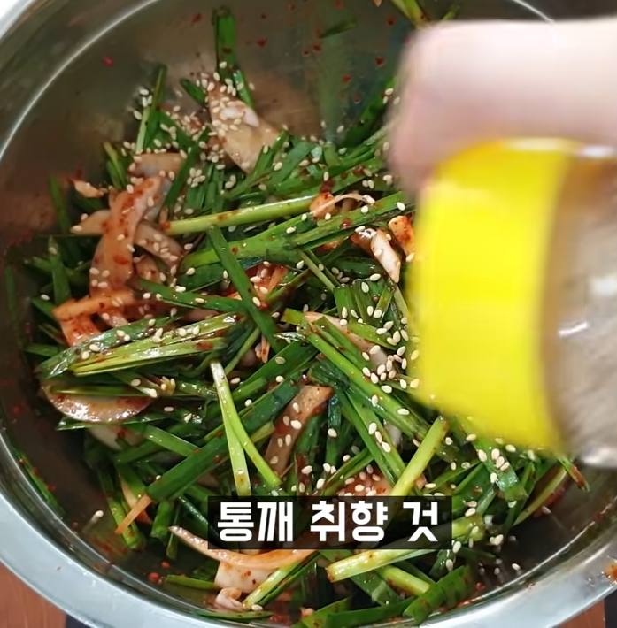 멸치액젓 4스푼, 식초 1스푼, 고추가루 3스푼, 다진마늘 1스푼, 참기름 1스푼, 설탕 1스푼을 섞어 만든 소스를 만든 뒤 썰어놓은 부추, 양파에 넣고 버무려줍니다. 이 겉절이는 고기의 맛을 한층 업그레이드해줄 거예요