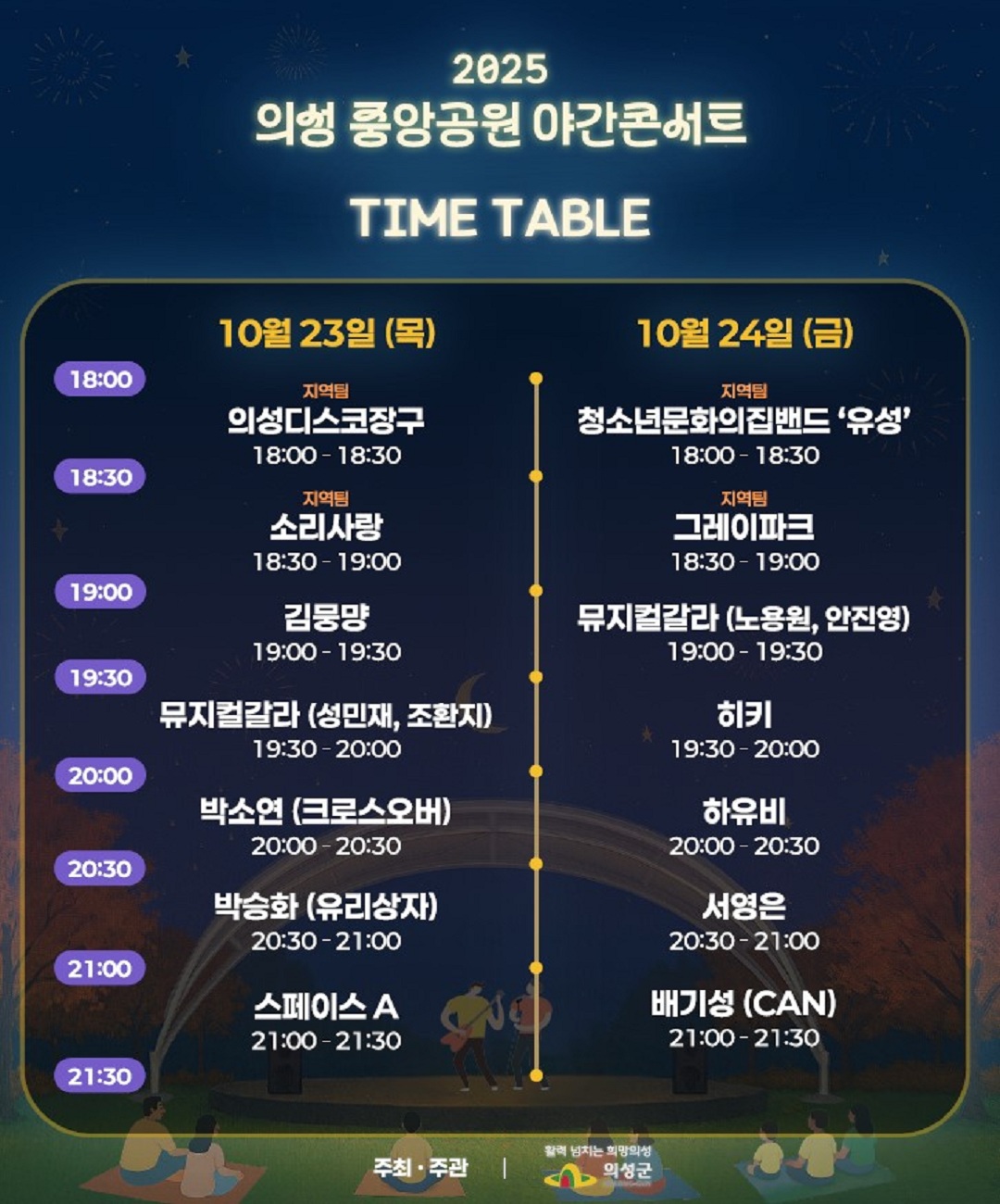 다음은 의성중앙공원에서 열리는 2025 의성 중앙공원 야간콘서트 행사에 대한 안내입니다.