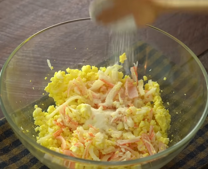 계란샐러드 – 삶은계란 2개(특란사용) – 크래미 1개, 34g – 설탕 3g(0.3스푼) – 마요네즈 20g(1스푼) – 후추가루 약간