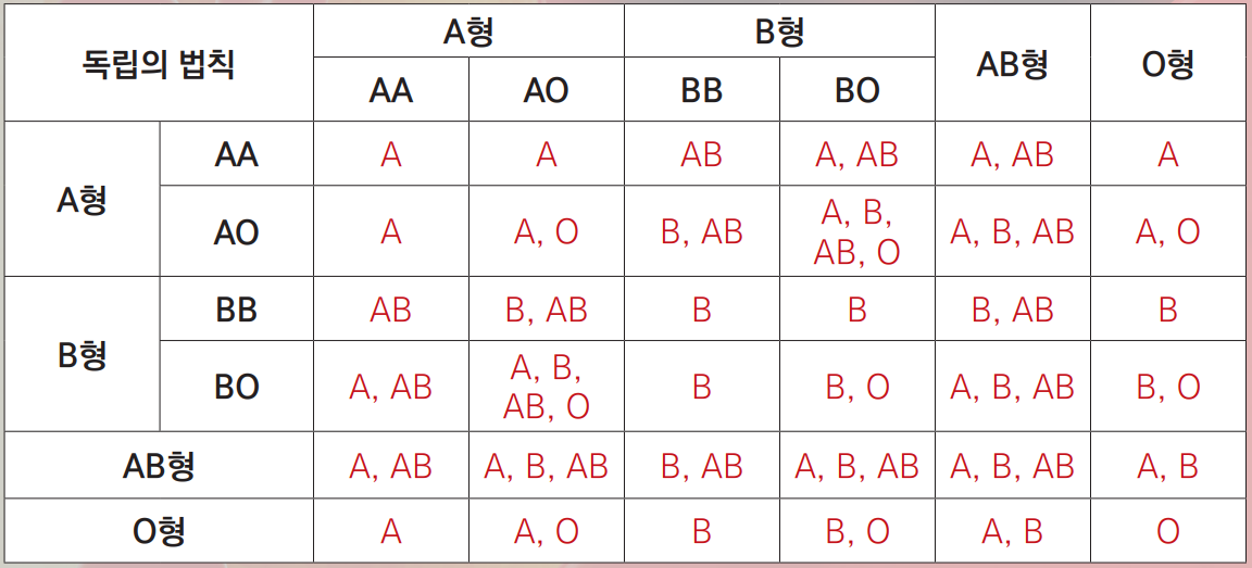 부모의 혈액형에 따른 자녀의 혈액형 확률