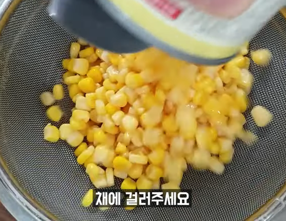 캔 제품을 선택하셨다면, 뚜껑을 열고 준비한 옥수수를 체에 잘 걸러 줍니다.