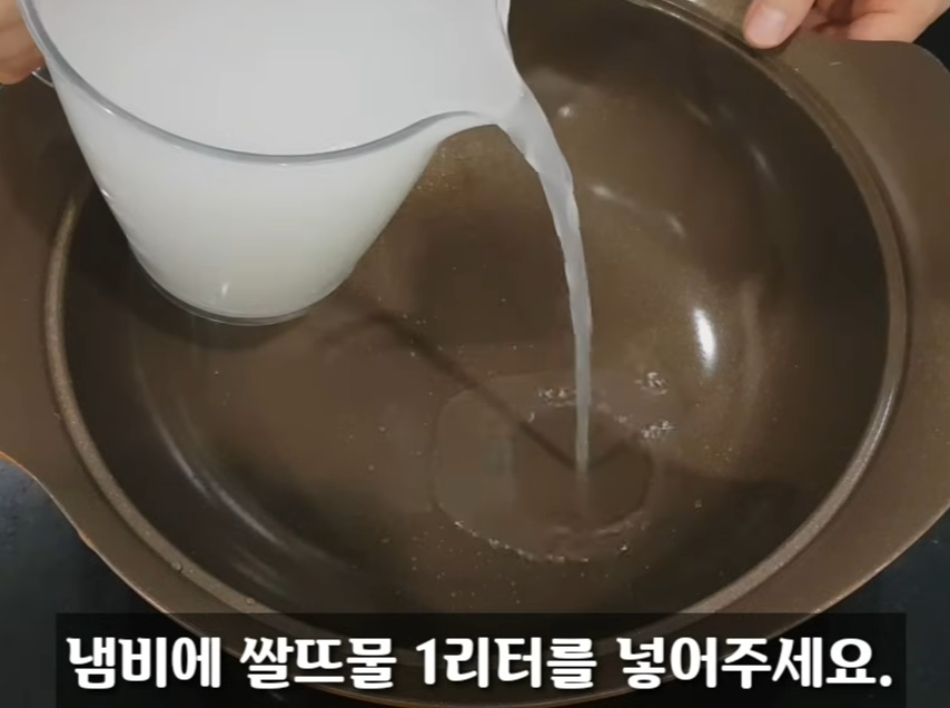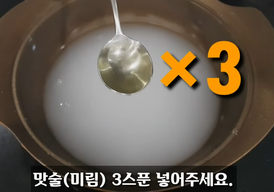 냄비에 쌀뜨물 1리터와 요리술 3큰술을 넣고 준비합니다.