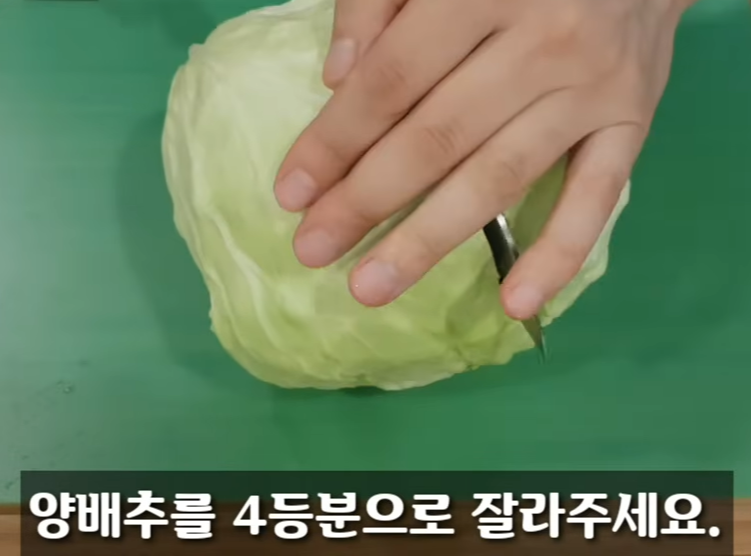 먼저 양배추의 겉잎을 제거하고, 4등분으로 자른 후 흐르는 물에 깨끗이 씻어줍니다.